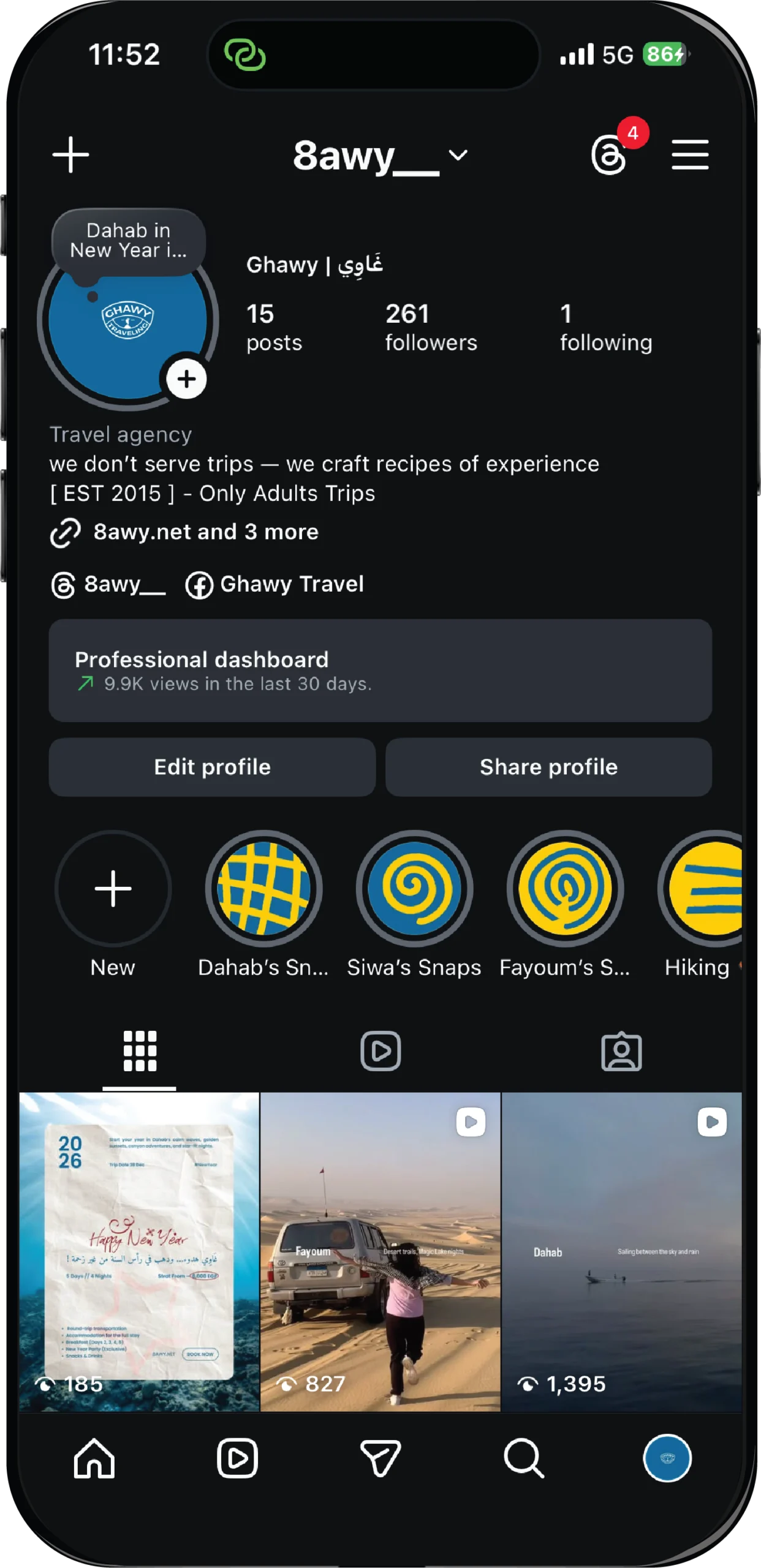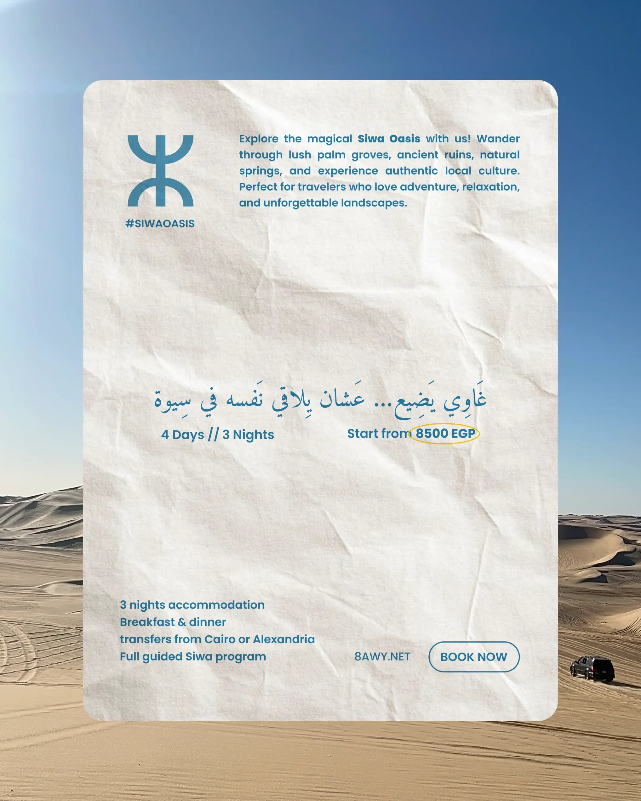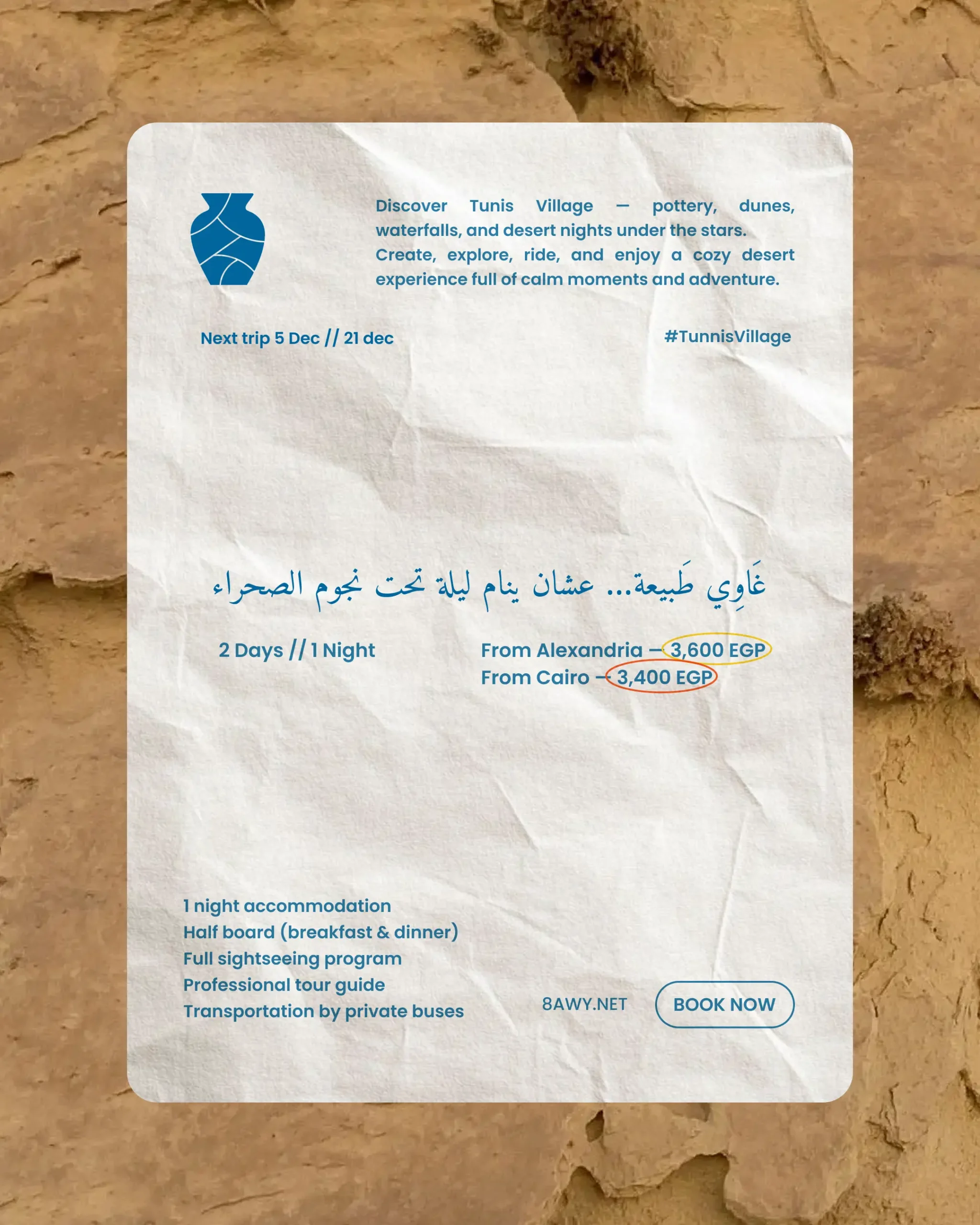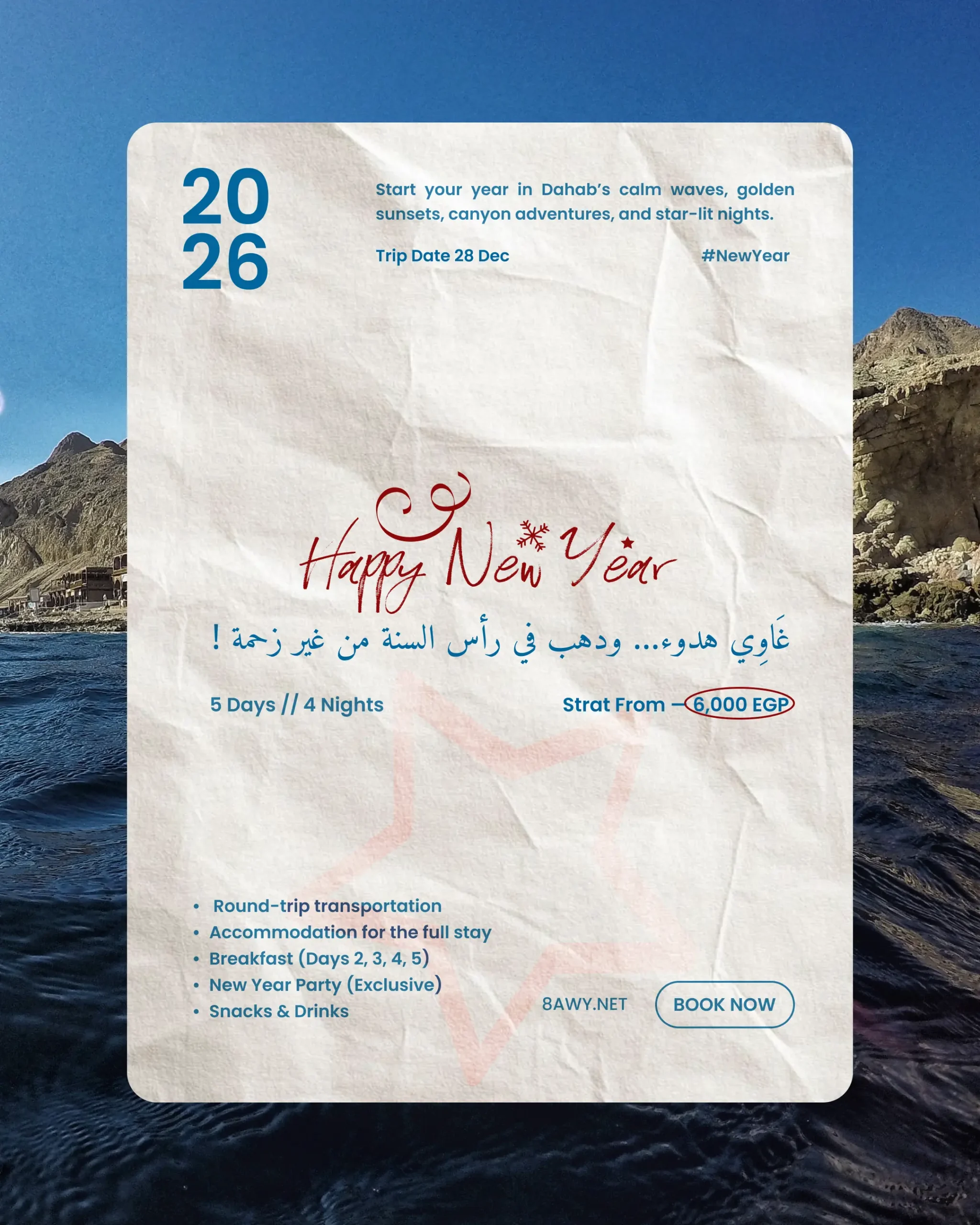 Start with the Brand Identity: Introduce “Ghawy” with short, expressive lines: “غَاوِي… مش بس اسم، ده إحساس، تجربة، ومغامرة بتبدأ من قلبك” Use Personal/Experiential Storytelling: Share the sense of adventure, discovery, or escape from the ordinary: “غَاوِي يضيع… عَشان يِلاقي نَفسه في سِيوة” “غَاوِي هدوء… عشان ينام ليلة تحت نجوم الصحراء” Connect the Experience to the Destination: Highlight the emotions each place evokes: “غَاوِي طَبيعة… مع بلو لاجون يِمسك عقلك من الضوضاء” “دهب في رأس السنة من غير زحمة… عشان بس تسمع صوت موج البحر وتنسى الدنيا” Invite the Audience to Experience It: End the storytelling with a simple, natural call to action: “سيب الدنيا وافصِل… وارجَع لنفسك” Tone and Style: Narrative, emotional, and in simple, clear sentences. Repeat “غَاوِي…” at the start of each line to create rhythm and reinforce brand identity. Focus on evoking feelings and imagination rather than just listing locations.