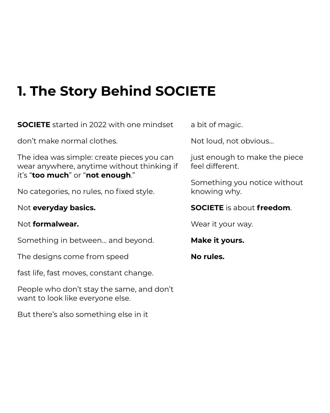 SOCIETE started in 2022 with one mindset don’t make normal clothes. The idea was simple: create pieces you can wear anywhere, anytime without thinking if it’s “too much” or “not enough.” No categories, no rules, no fixed style. Not everyday basics. Not formalwear. Something in between… and beyond. The designs come from speed fast life, fast moves, constant change. People who don’t stay the same, and don’t want to look like everyone else. But there’s also something else in it