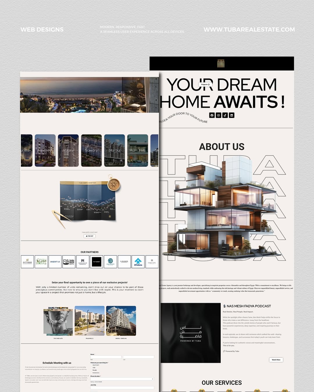 Tuba Real Estate is a leading real estate marketing company that blends innovation with strategic growth. Established in 2020 as a partnership between Al-Shorouk Development Company and Emaar, Tuba has played a key role in marketing premium residential and investment properties across Alexandria, the North Coast, and Cairo.
